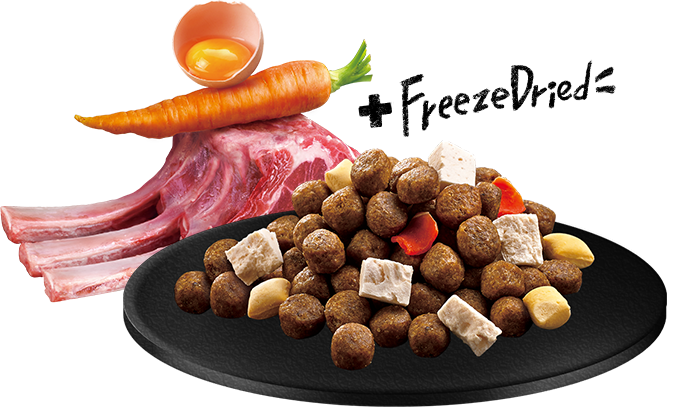 嚴選大塊雞肉與鮮蛋凍乾,搭配香甜胡蘿蔔切片,美味加倍