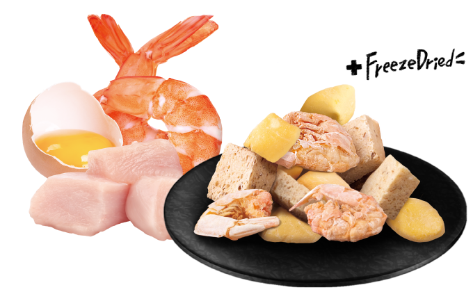HOME > MENU FOR PETS > 貓 / 凍乾佐餐杯 / 雞肉+蝦子+雞蛋 Chicken + Shrimp + Egg 雞肉+蝦子+雞蛋全齡貓 每餐配一杯 晚餐大升級 多樣食材組合 多重食感體驗 蝦多維生素 雞蛋好吸收 一盒5杯/一杯7g 主要原料 凍乾雞肉、凍乾雞蛋、凍乾蝦子 成份分析保證值 粗蛋白質 ≧ 43.1% 粗脂肪 ≧ 2.3% 粗纖維 ≦ 2.3% 水份 ≦ 5.0% 灰份 ≦ 8.3% 熱量 24.6kcal/杯 < 返回產品清單瀏覽下個產品 >