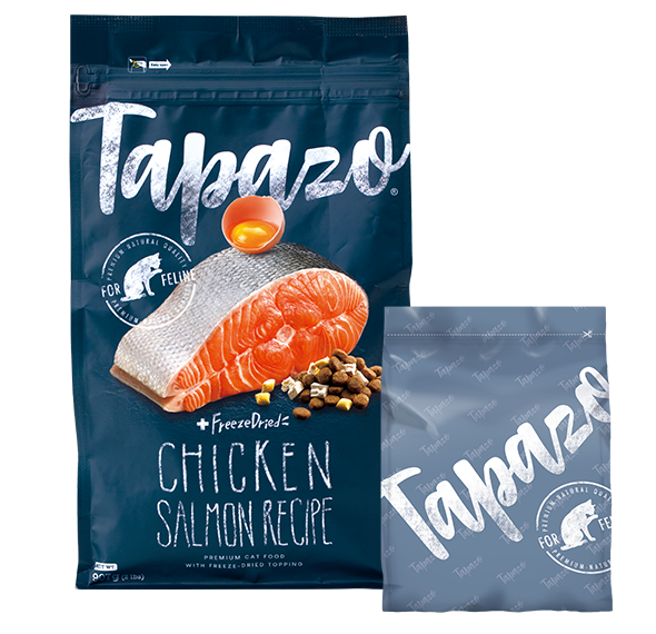 乾燥鮭魚、乾鷹嘴豆、乾豌豆、豌豆粉、乾燥雞肉、馬鈴薯粉、雞脂(以混合生育酚保存)、豌豆蛋白質、馬鈴薯蛋白質(天然調味料、乾燥甜菜根、乾燥蕃茄粕、乾燥菊苣根(菊苣纖維與果寡糖之來源)、纖維素粉、食鹽、磷酸氫鈣、碳酸鈣、研磨亞麻籽、乾燥雞蛋、啤酒酵母萃取物、氯化膽鹼、維生素E、維生素A、維生素D3、維生素B12、維生素C、核黃素(維生素B2)、硫胺素(維生素B1)、葉酸、生物素(維生素B7)、鹽酸吡哆醇(維生素B6)、菸鹼酸(維生素B3)、維生素K、胡蘿蔔素、泛酸鈣(維生素B5)、硫酸銅、碘酸鈣、硫酸鐵、氧化錳、氧化鋅、亞硒酸鈉、蛋白質螯合銅、蛋白質螯合鐵、蛋白質螯合鋅、蛋白質螯合錳、牛磺酸、DL-甲硫氨酸、蕬蘭萃取精華、L-抗壞血酸-2-聚磷酸鹽(維生素C活性來源)、肌醇(維生素B8)、嗜酸乳酸桿菌、乾酪乳酸桿菌、比菲德氏菌、腸球F菌)